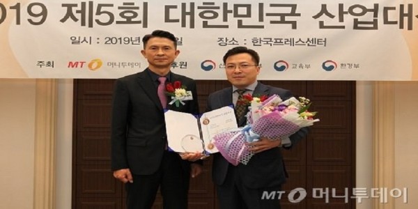 한성호 아디포랩스 대표(사진 오른쪽)가 '신기술대상 3년 연속상'을 수상한 뒤 박종면 머니투데이 대표와 기념사진을 찍고 있다/사진=중기협력팀 오지훈 기자